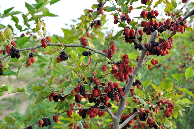 ⒊ 成熟早、品质优。桑椹的成熟期在黄淮流域为5月1日(江南以南更早),采摘期20-30天,麦收前全部采完,不误农时。桑椹明亮晶莹,酸甜可口,风味极佳,令人垂涎欲滴,百吃不厌。